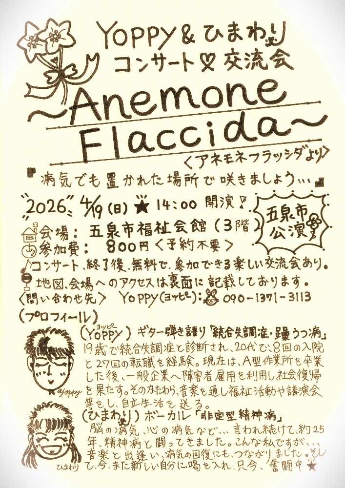 オリジナル曲とトークを中心に、カバー曲も沢山演らせてもらいます!